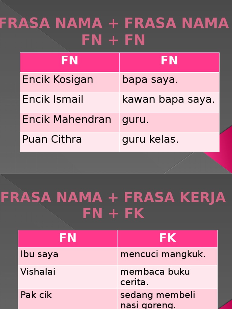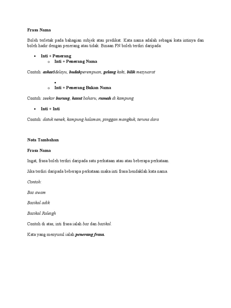 For your search query frasa nama dan frasa kerja mp3 we have found 1000000 songs matching your query but showing only top 10 results. Kata nama tersebut meliputi semua jenis kata nama seperti kata. 6 inti frasa frasa nama (s) frasa kerja (p) pasir (inti) putih (pen) roboh (inti) di tepi kali (pen) frasa nama (s) frasa nama (p) haji (pen) mhd amin (inti) pensyarah (inti) bahasa (pen) frasa nama (s) frasa adjektif (p) gadis (inti) desa itu (pen) cantik (inti) amat (penguat). Perkataan yang mendahului dan mengikutinya. Tajuk 4 susunan konstituen frasa nama bahasa melayu.