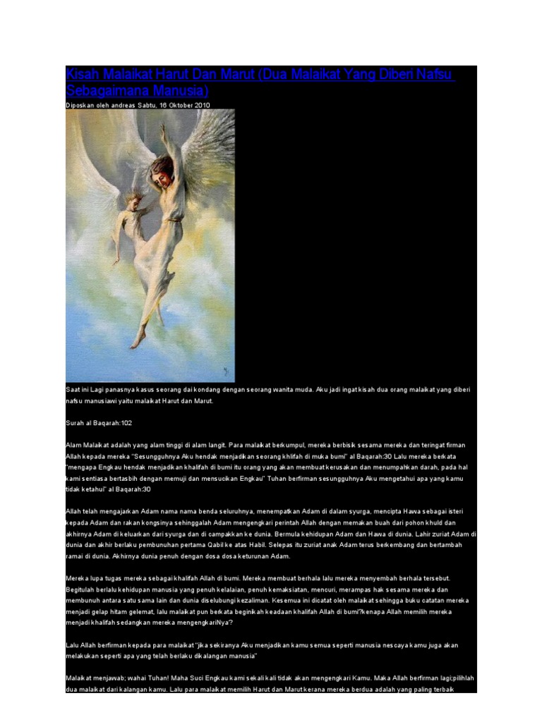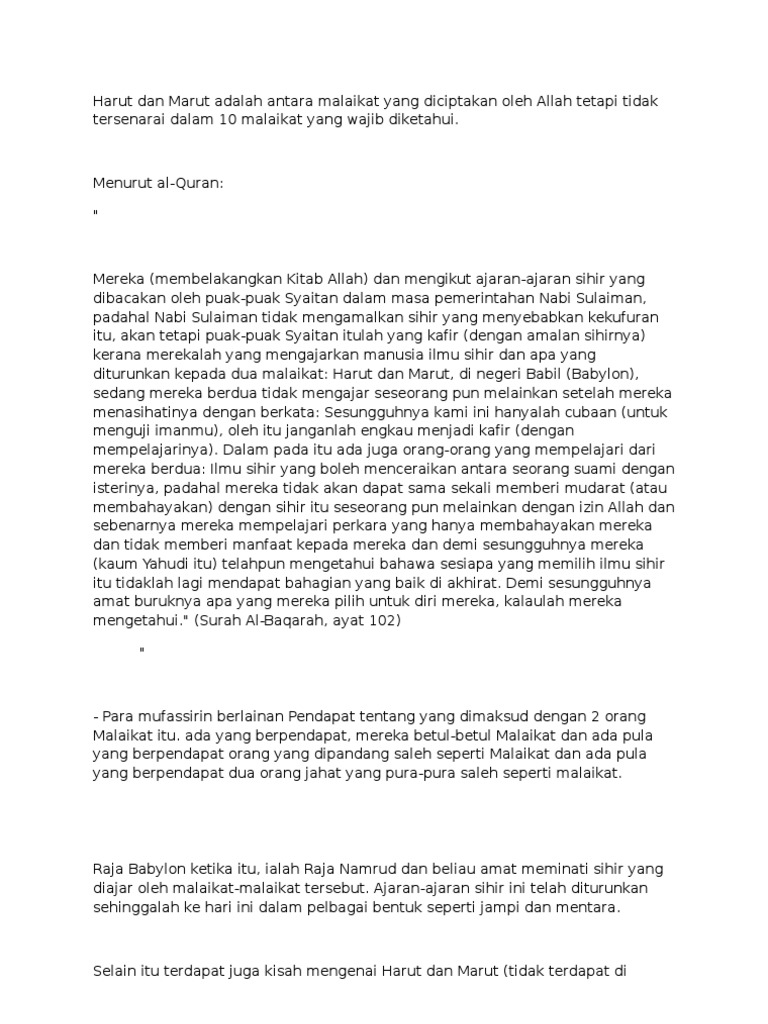 Belum tentu jika kita berada dalam posisi orang yang kita kritik akan lebih baik dari keadaan mereka. Maka allah pun memilih dua malaikat, yakni harut dan marut untuk menguji apa yang dikatakan para malaikat. Para mufassirin berlainan pendapat tentang yang dimaksud dengan dua malaikat itu. Sesungguhnya kami hanya cobaan (bagimu), sebab itu janganlah kamu kafir. Itulah kisah malaikat harut dan marut yang sebenarnya, mereka taat kepada perintah allah swt. Harut dan marut, menurut pendapat ini. Mereka disiksa dengan rasa dahaga sementara di dekat lidah mereka diletakkan air. Mereka diturunkan allah di negeri babil, yang menurut sejarawan adalah negeri babilonia. Ada juga yang meminta diajarkan sihir, merekapun tahu ilmu itu, tetapi siapa yang hendak belajar diberinya nasihat terlebih dahulu, supaya jangan dipergunakan kepada yang buruk. Isi kitab sihr harut wa marut juz 1 : Hal ini disebutkan melalui lisan dua malaikat, yaitu harut dan marut. Mereka (para setan) mengajarkan sihir kepada manusia dan apa yang diturunkan kepada dua orang malaikat di negeri babil yaitu harut dan marut, sedang keduanya tidak mengajarkan (sesuatu) kepada seorangpun sebelum mengatakan: Dan ada sebagian manusia yang memaksa untuk belajar sihir dari kedua malaikat itu walaupun telah diingatkan dan diberitahu.